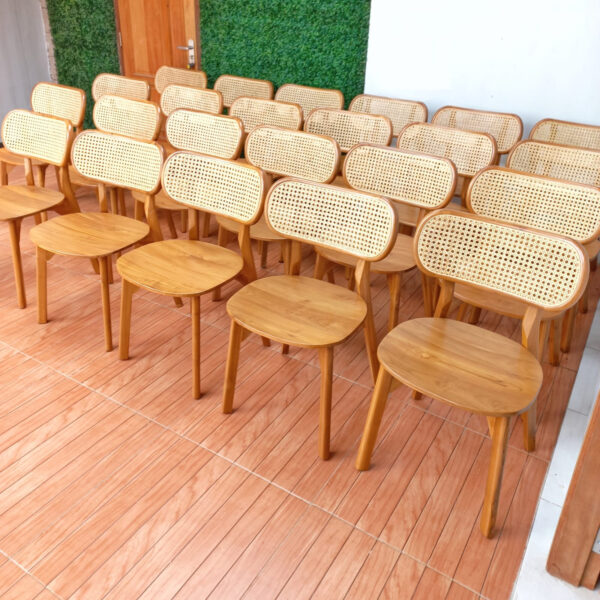 - Finishing dengan warna kayu alami yang kaya memperlihatkan keindahan serat kayu dan menambah kilau elegan pada produk. Perlindungan lapisan akhir juga memastikan permukaan meja dan kursi tahan terhadap goresan dan noda.